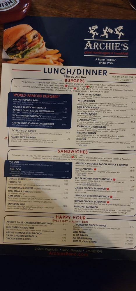 Archie’s Giant Hamburgers & Breakfast is a bustling burger joint in Reno, NV, offering a range of delectable breakfast and brunch options. The menu boasts classics like the All American Breakfast and specialty dishes like the Basco Benedict Breakfast. For those with a sweet tooth, the Hot off the Grill section offers tempting treats like French Toast Combo and Full Stack Breakfast. Customers rave about the friendly service and delicious food, with mentions of standout items like the bacon and burgers. The cozy atmosphere, perfect for pre-game gatherings, combined with good happy hour deals, makes Archie’s a must-visit spot. With a focus on quality ingredients and attentive staff, this restaurant has earned a loyal following for its tasty offerings and welcoming ambiance.